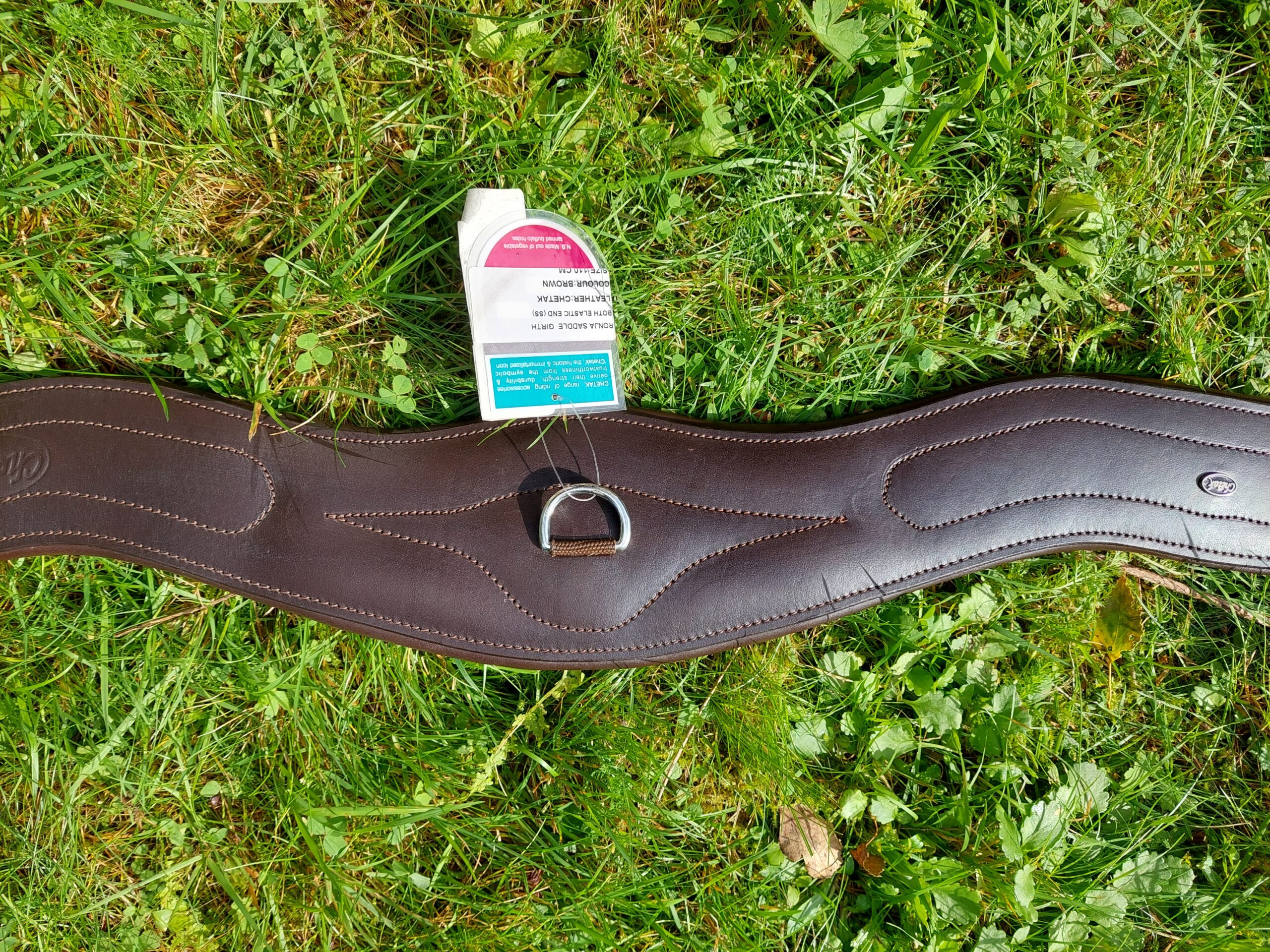 Anatomisk lädergjord med resår i båda ändar. Ringar för hjälptyglar. Chetakläder.
