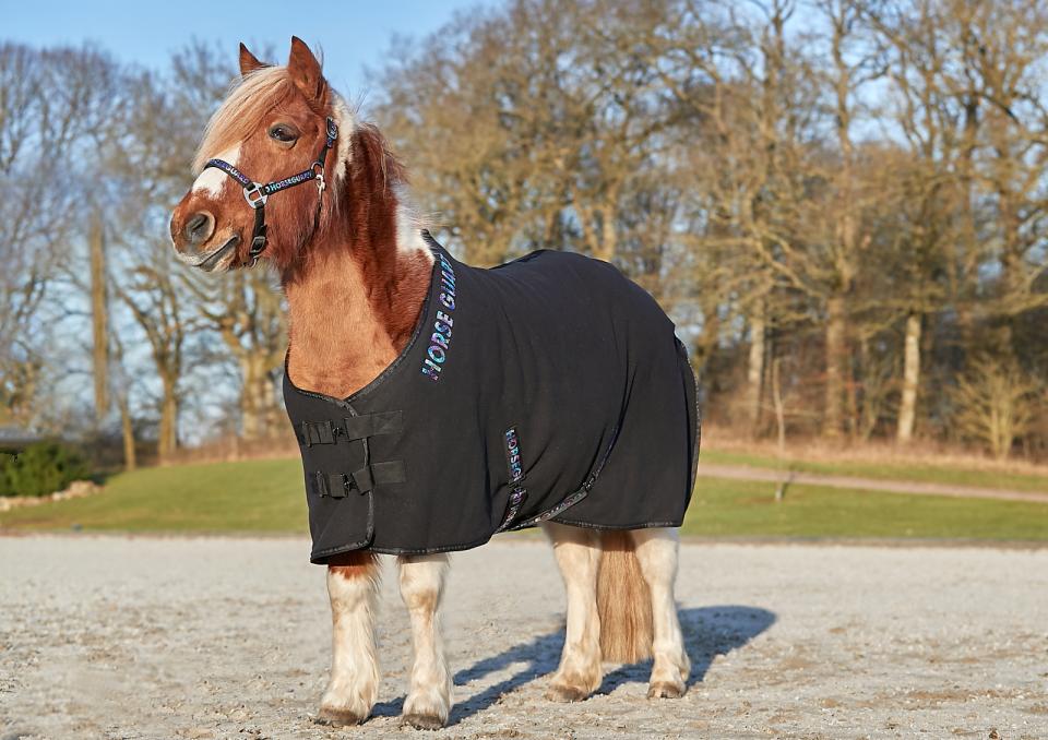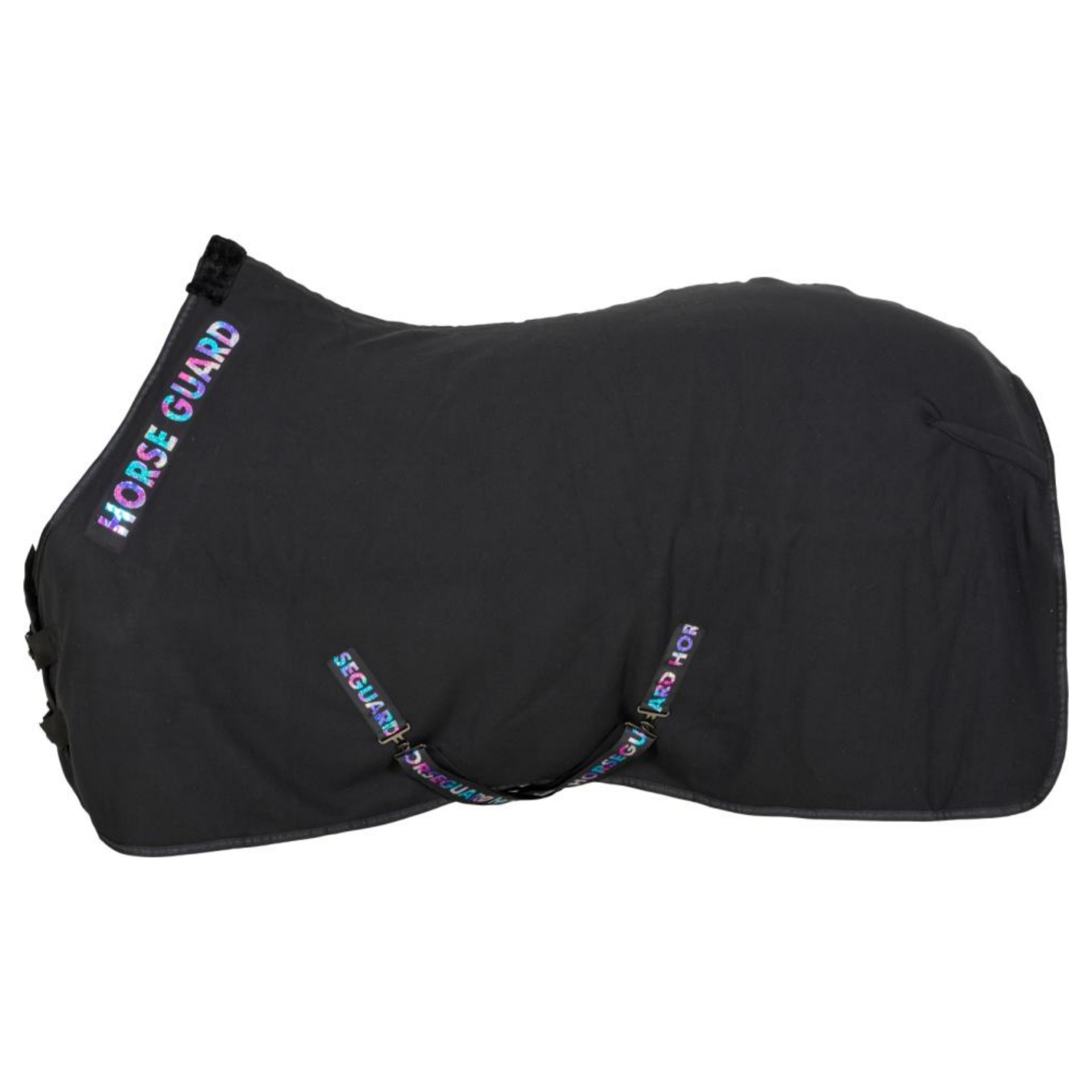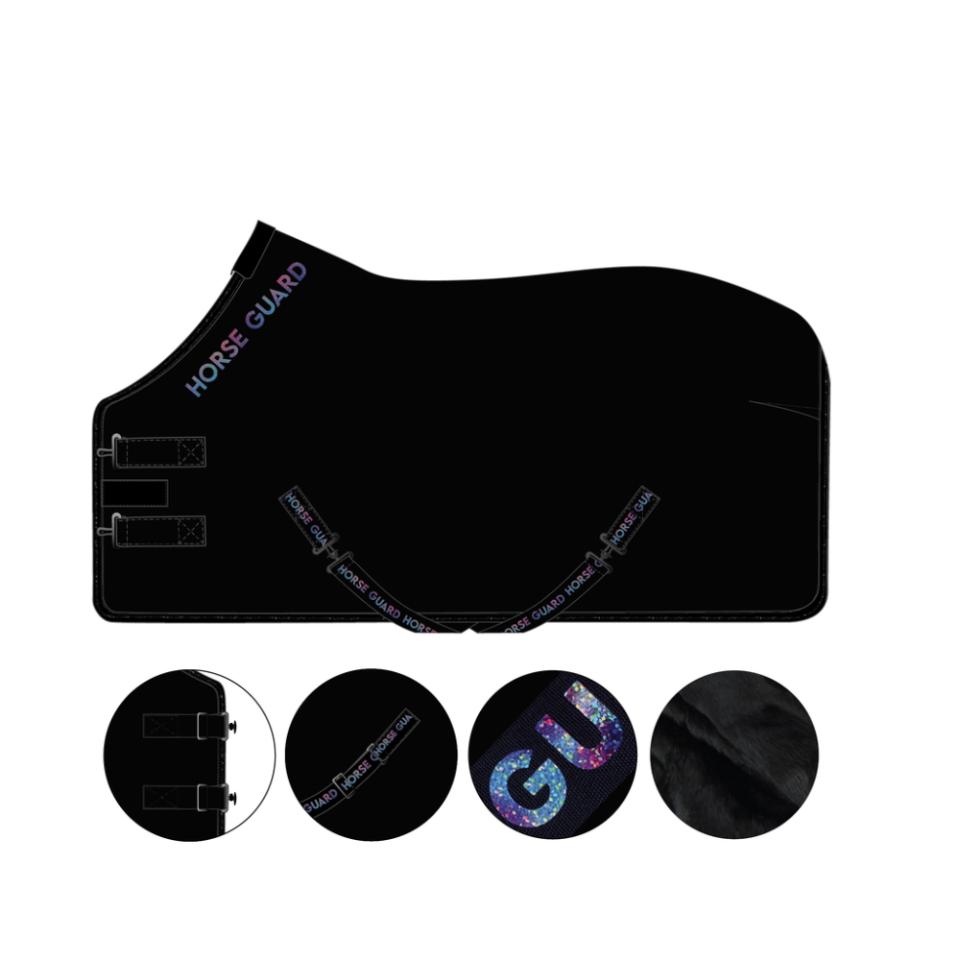 Cooler täcke i mjukt fleecematerial med foder i fuskpäls. Holografiskt glitterlogotypband i en regnbågseffekt. Justerbar dubbel stängning framtill, avtagbara dubbla X gjordar och svansrem för att hålla täcket säkert på plats. 100 % Polyester.